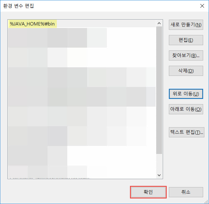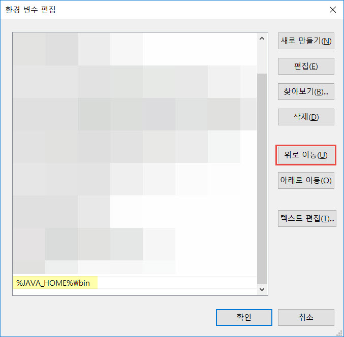 새로 만들기를 통해 %JAVA_HOME%\bin 을 입력해주시고, 해당 변수를 위로 이동 버튼을 통해 가장 위로 올려주세요.