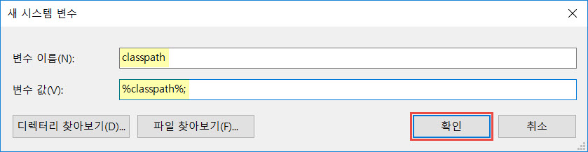 다음은 jdk 환경 변수를 설정한 것과 동일하게 시스템 변수를 새로 만들어줍니다. 변수 이름은 classpath, 변수 값은 %classpath%; 입니다. (%와 ; 기호와 띄어쓰기에 주의해주세요.)