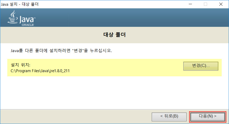 다음은 jre 설치 경로를 설정하는 단계인데, jre 또한 설치 경로를 변경하시면 변경하시고 그렇지 않다면 디폴트로 설정하고 다음 단계로 넘어가시면 됩니다.