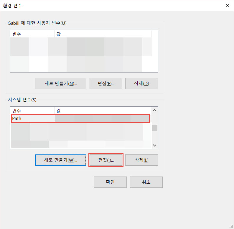 환경 변수 편집 마지막 단계로 시스템 변수에 원래 존재하는 Path 변수를 편집하도록 하겠습니다. 하단의 편집을 선택해 편집창으로 들어가주세요.