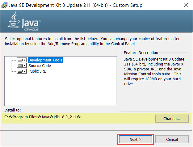 저의 경우 jdk의 경로를 디폴트로 하였는데, 만약 경로 변경이 필요하시면 Change 버튼을 선택해 바꿔주시고 Next 버튼을 눌러 다음 단계로 넘어갑니다.