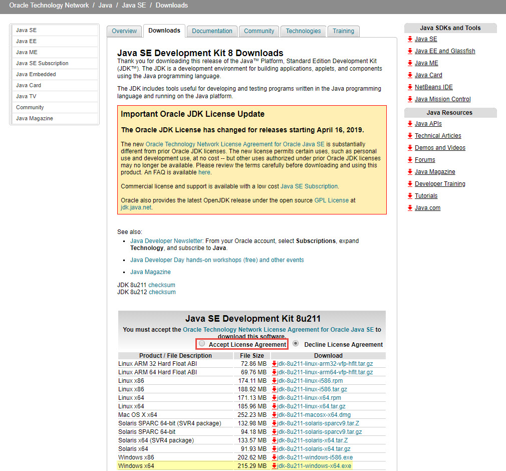 페이지 하단의 Java SE Development Kit 8u211 박스의 Accept License Agreement 항목을 체크해주시고, 각자 컴퓨터 OS에 해당하는 설치파일을 다운받으시면 됩니다. 저의 경우 Windows 64bit 환경이기에 마지막 항목을 다운받았습니다.