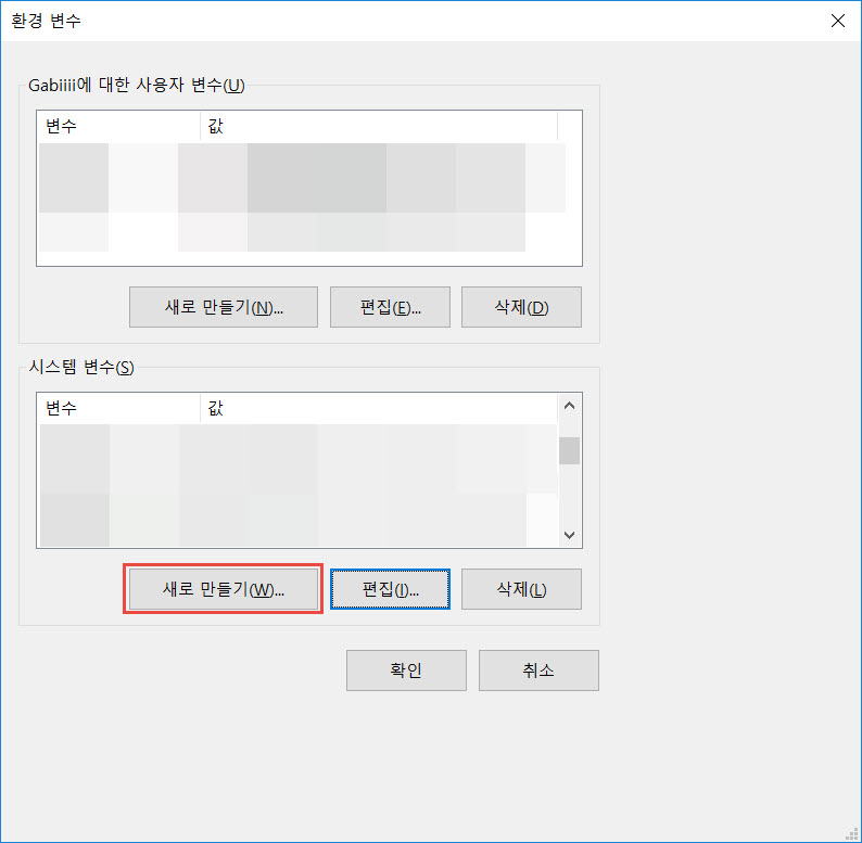 환경변수 창이 뜨면 하단의 새로 만들기를 눌러 설치한 Java SE의 경로를 잡아줍니다.