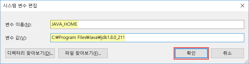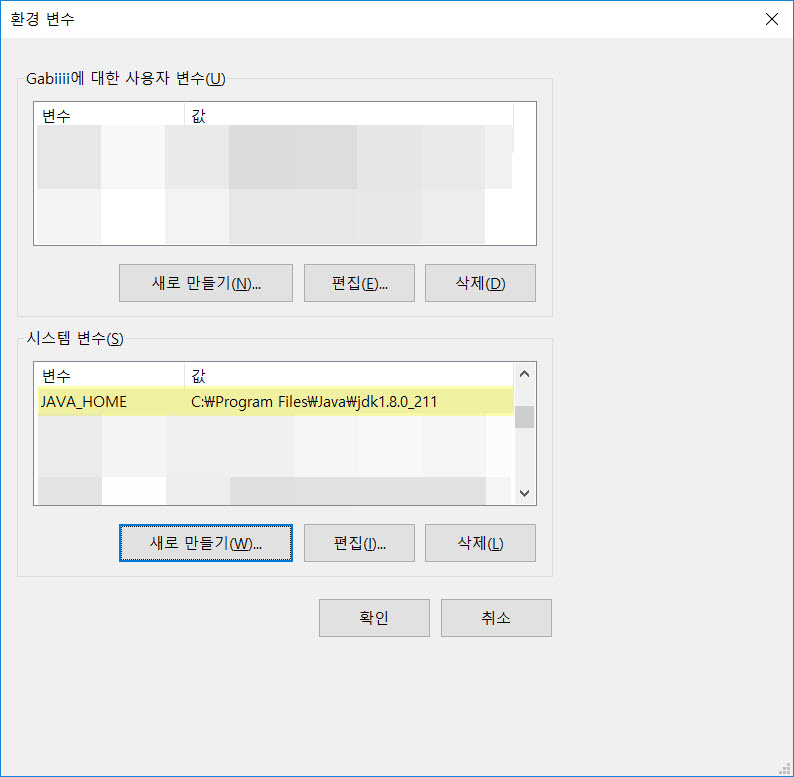변수 이름에는 JAVA_HOME 을, 변수 값에는 전에 확인한 jdk 경로인 C:\Program Files\Java\jdk1.8.0_211 를 붙여넣어 줍니다. (경로는 각자가 지정한 jdk 경로를 붙여넣어주시면 됩니다. 제가 넣은 경로는 Java SE를 설치할 때 디폴트로 설정된 경로입니다.) 이후 확인을 눌러 해당 사항을 저장해주세요.