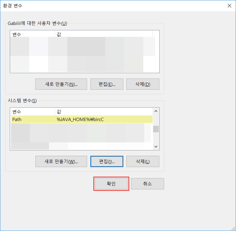 Path 변수가 위와 같이 변경되었으면 환경 변수 편집창에서 확인을 눌러 저장해주시고 빠져나오시면 됩니다.